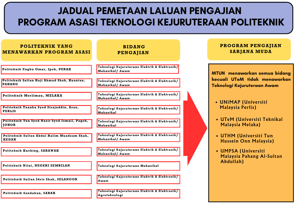 Bagi memperluaskan lagi capaian dan impak program ini, sebanyak lima (5) institusi tambahan akan mula menawarkan Program Asasi Teknologi Kejuruteraan bermula Sesi I 2025/2026, menjadikan keseluruhan sebanyak sepuluh (10) institusi pelaksana di seluruh negara.